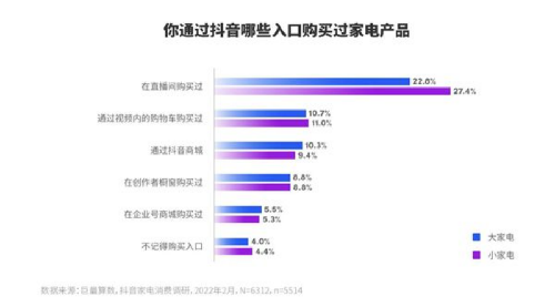 一方面,用户在抖音电商“搜商品”、“逛商城”的消费习惯已逐渐形成。根据巨量算数《2022抖音电商家电行业洞察报告》,用户除通过短视频与直播购买家电产品外,选择抖音商城来购买的比例正在上升,成为第三大重要的购买入口。