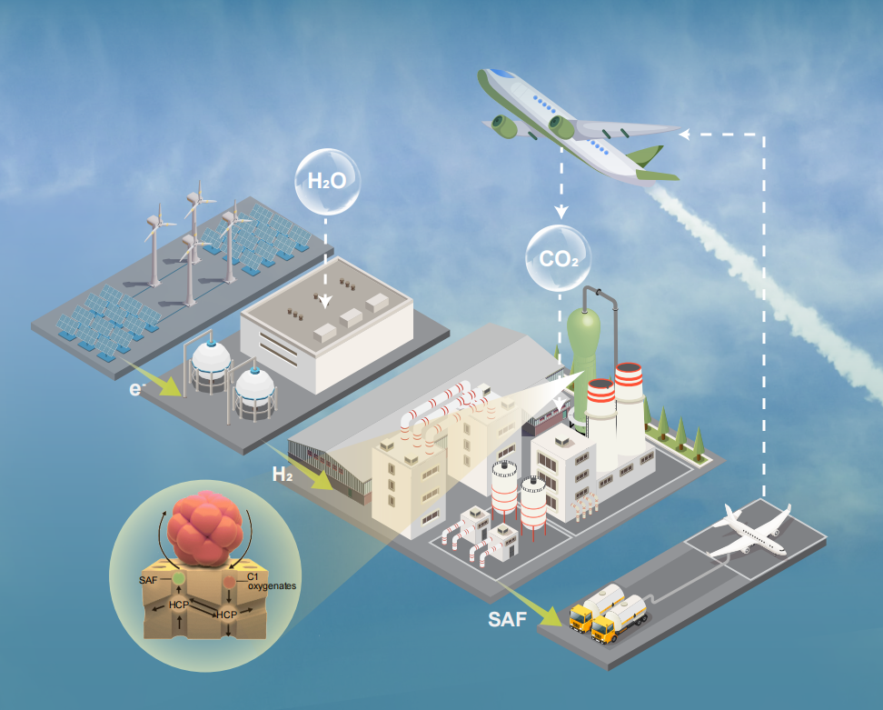 其中,实验室在绿色航煤技术的研究成果突破尤为引人注目。针对航空航运碳减排难题,实验室联合清华团队提出“生物质加氢”与“二氧化碳直接利用”双路径方案:该技术凭借碳氢最佳匹配、流程短的优势备受全球关注。其路线在捕集二氧化碳的同时,可一步将其高效转化为含80%以上可持续航空燃料的产品,更加符合我国的碳中和路线。该技术所用二氧化碳原料主要来自工业废气或空气捕获,供给几乎无上限;而我国风电、光伏装机量、发电量高居全球第一,通过成熟的电解水工艺即可制取足够绿氢,有效解决了传统工艺中原料依赖性强、能耗高的问题。目前,实验室正与中国民航合作推进技术落地,力争形成全球碳减排“中国方案”。